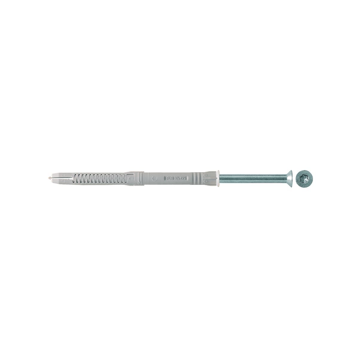 Фасадный дюбель FUR-T состоит из высококачественного нейлонового дюбеля и шурупа из оцинкованной стали с потайной головкой. FUR-T монтируется методом сквозного монтажа, что экономит время установки. При заворачивании шурупа зубцы дюбеля расширяются внутри отверстия в полнотелом строительном материале и дюбель передает нагрузки за счет сил трения. В пустотелых строительных материалах происходит анкеровка трением в области перемычек и анкеровка формой в пустотах за счет упора распорных зубцов в перемычки. Фасадный дюбель fischer FUR предназначен для надежного крепления фасадных конструкций, окон, ворот, дверей во всех строительных материалах.