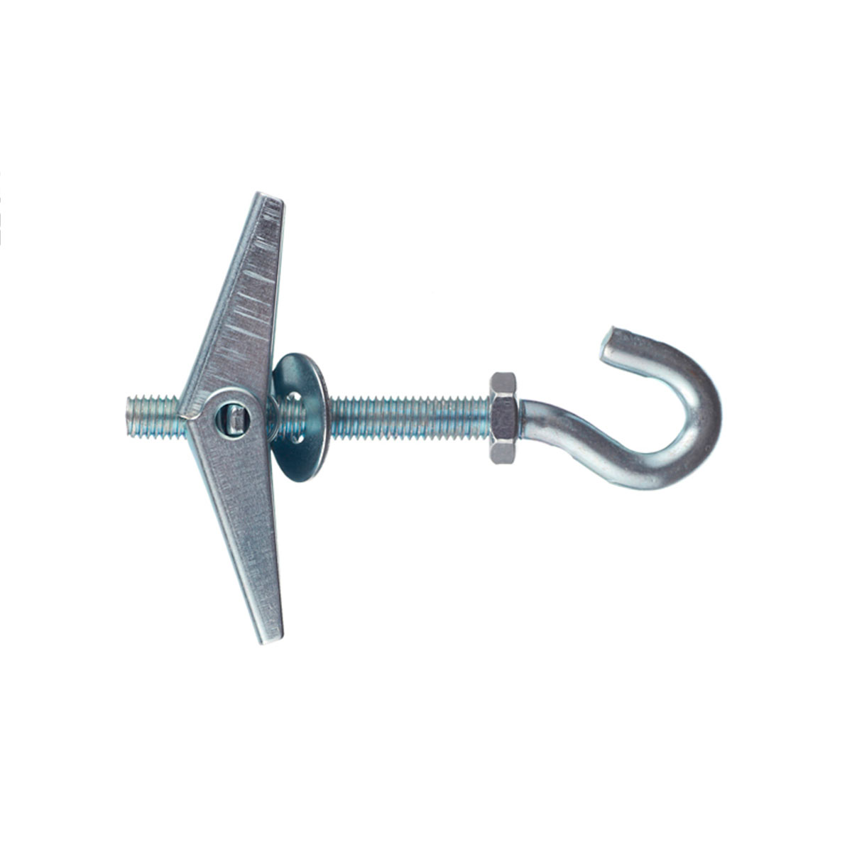 Дюбель-крюк складной пружинный, L-образный - предназначен для подвеса и крепления легких конструкций к гипсокартонным плитам, древесно-стружечным плитам, а также к другим пустотелым строительным материалам. Дюбель складной состоит из стержня с метрической резьбой, пружинного механизма с держателями. При монтаже, пружинный механизм дюбеля автоматически раскрывает стопорные крылья в пустоте, образуя надежную опору.