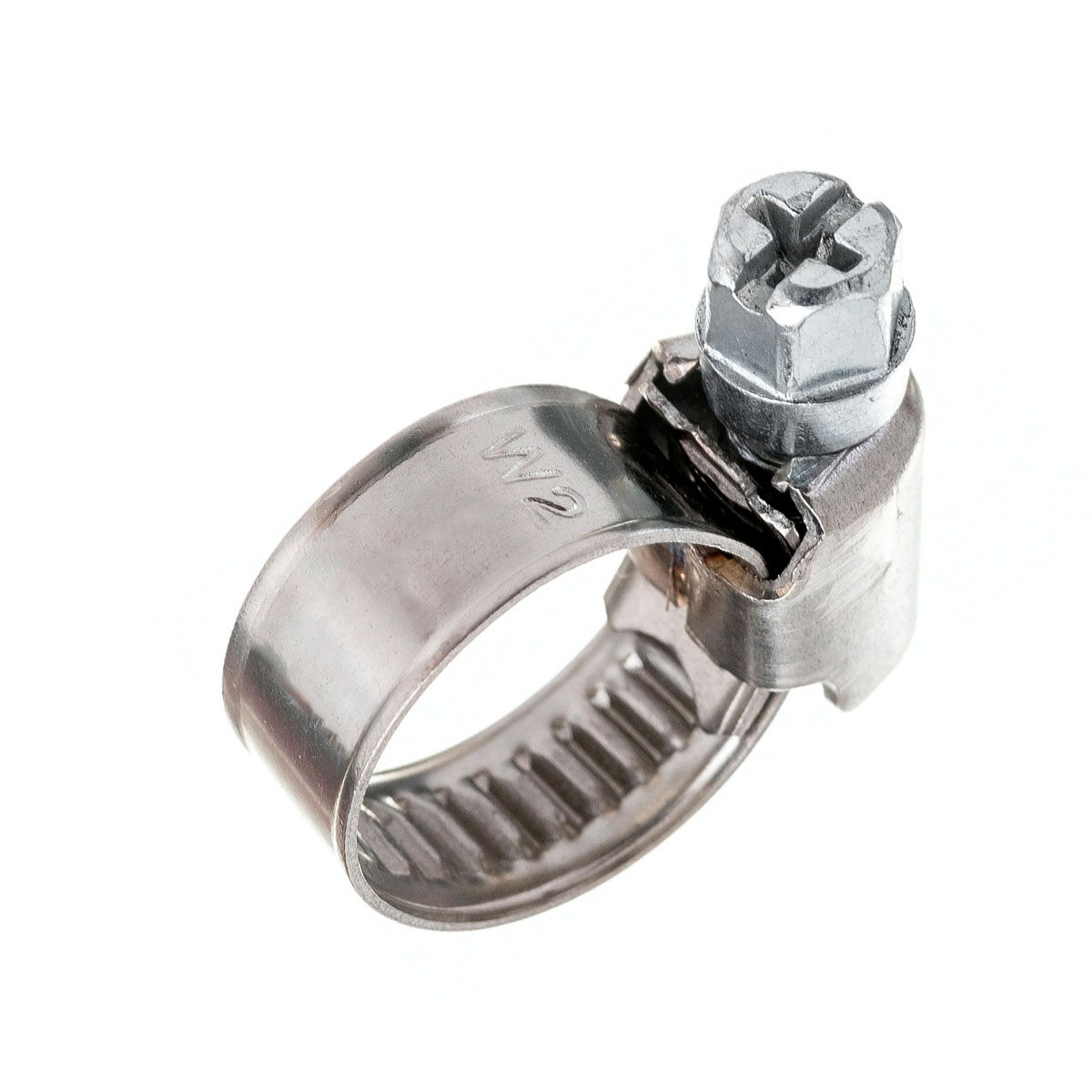 Хомут червячный из нержавеющей стали W2. В конструкцию хомута входит металлическая полоса с дорожкой с зубцами и винт для затягивания. Используется для фиксации шлангов и труб в местах с повышенной вибрацией, в том числе в водопроводах и системах отопления. Хомуты выдерживают многократную переустановку.