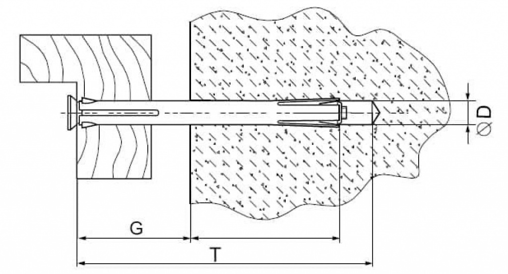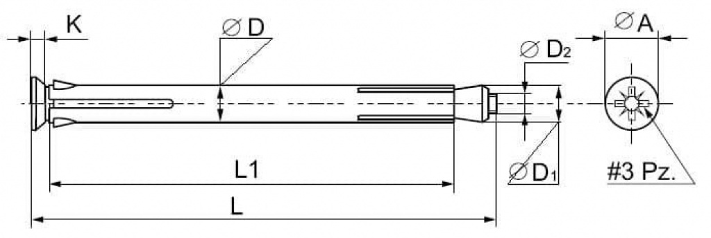 Предназначен для крепления деревянных, металлических рам и деревянных коробок без прижима к бетонному основанию, строительному камню, полнотелому и пустотелому кирпичу. Сквозной монтаж. Анкер состоит из стальной разрезанной втулки, винта со шлицем PZ 3 и конусной гайки. Конструкция анкера выполнена таким образом, что расклинивание и фиксация его про исходит сначала в бетонном основании, затем в прикрепляемом материале.